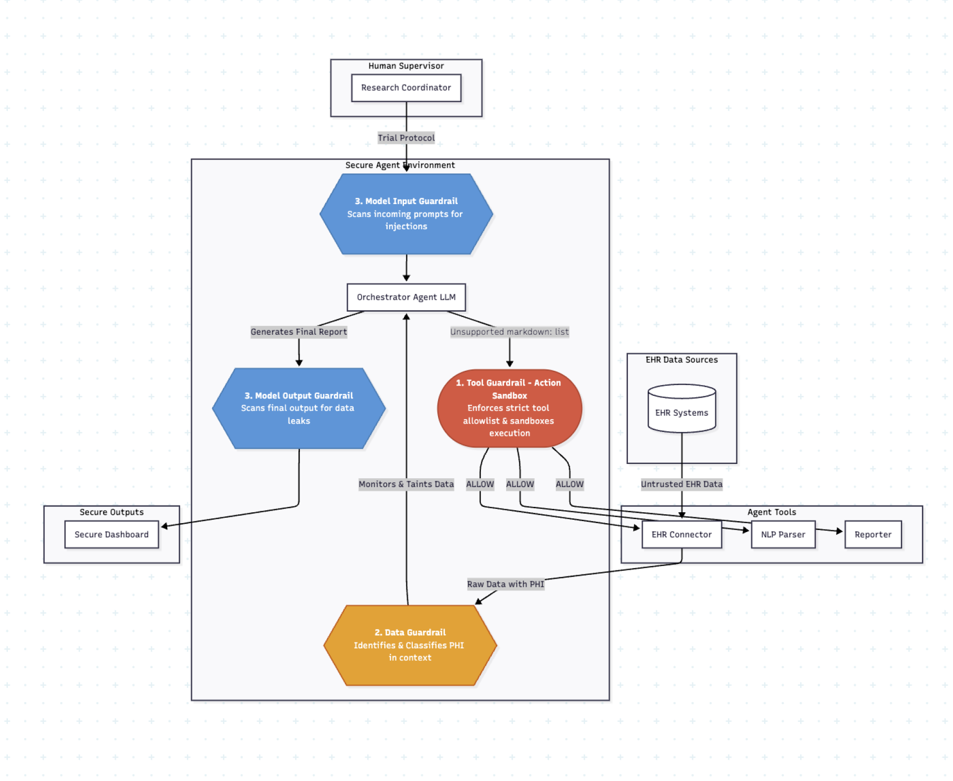 A Tool Guardrail enforces an action sandbox, blocking unauthorized network calls. A Data Guardrail identifies and taints any PHI entering the context. Model Guardrails scan inputs for injection signatures and outputs for data leaks.