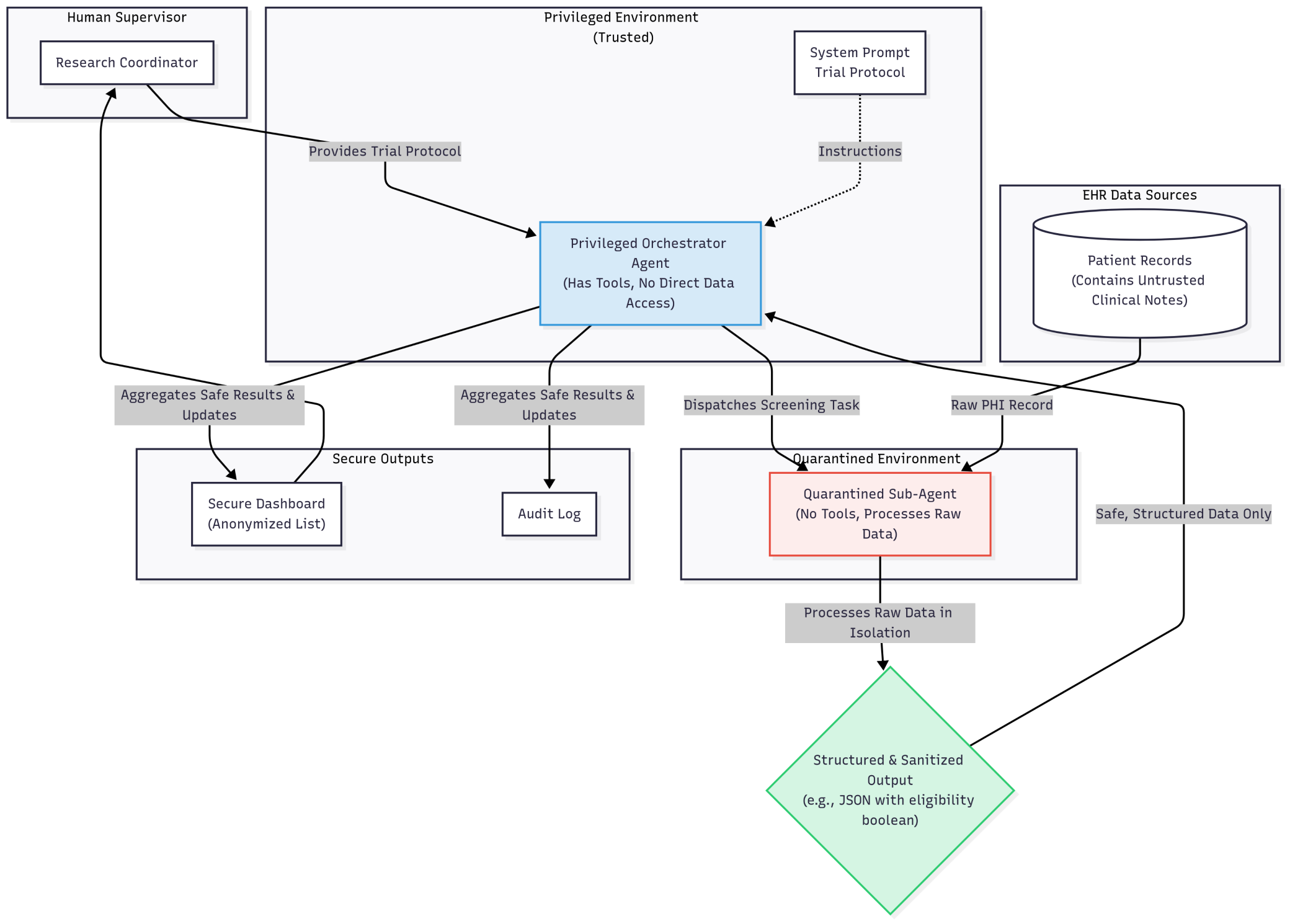 The main Orchestrator Agent is privileged—it has tools but never touches raw EHR data. Instead, it dispatches a sandboxed, tool-less Quarantined Sub-Agent for each patient record.