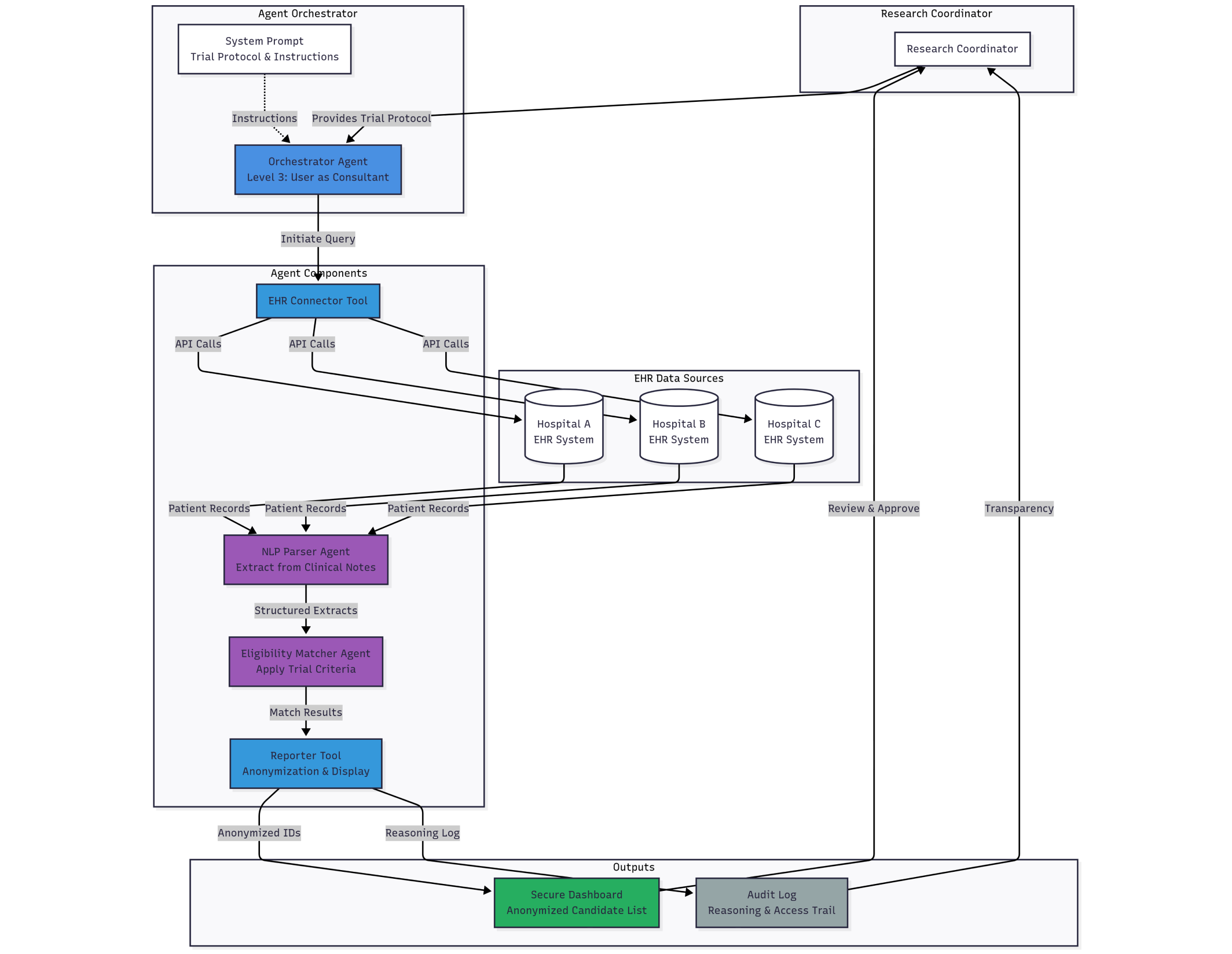 Architecture: The system uses an EHR Connector Tool to query databases, an NLP Parsing Agent to read clinical notes, an Eligibility-Matching Agent to apply trial criteria, and a Reporting Tool to deliver anonymized candidate lists to a research coordinator.
