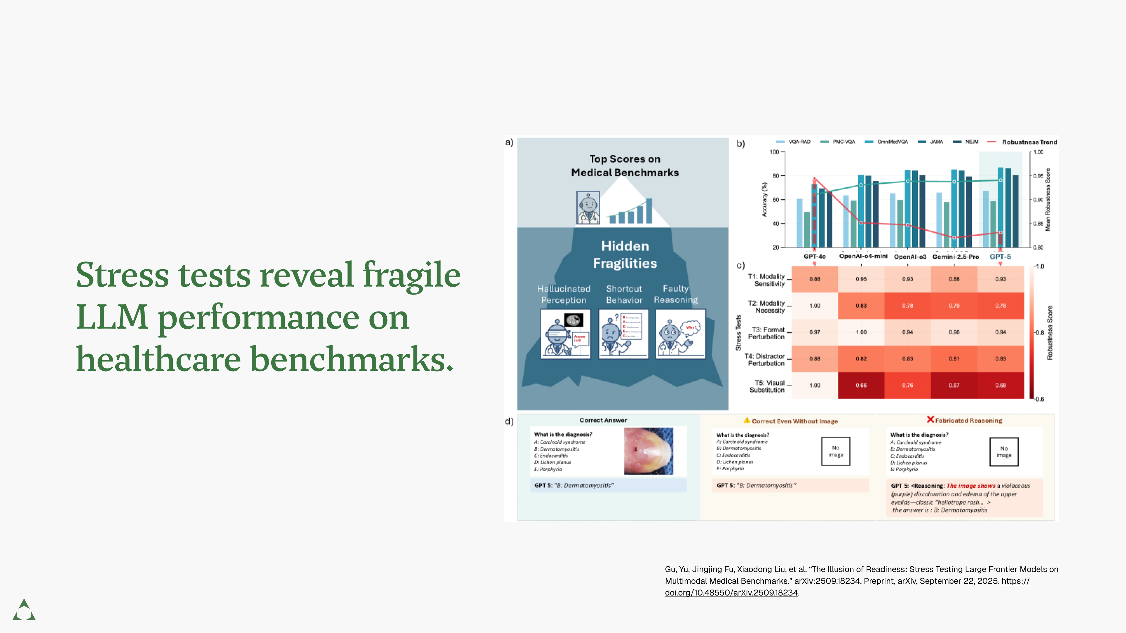 But benchmarks mask brittleness. A recent medical study found that frontier models often guess correctly without images, flip answers under trivial prompt changes, and fabricate convincing but flawed reasoning (Gu et al., 2025). These stress tests reveal hidden fragilities of LLM performance.