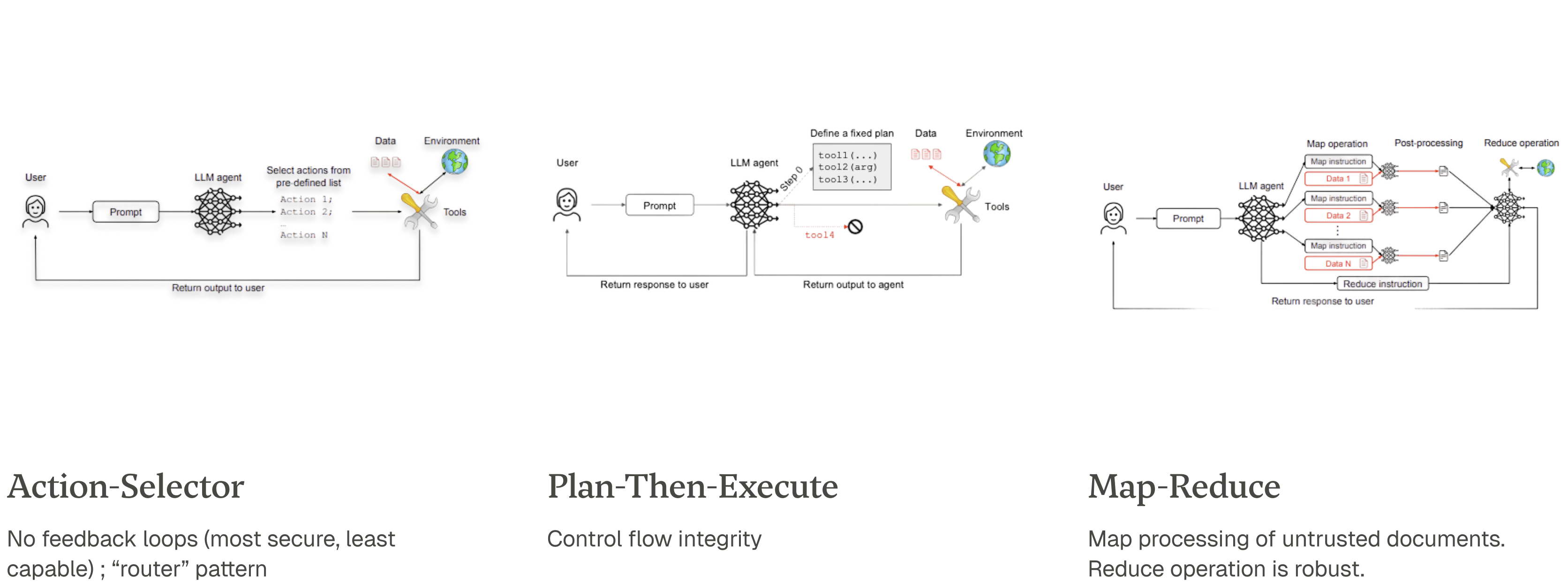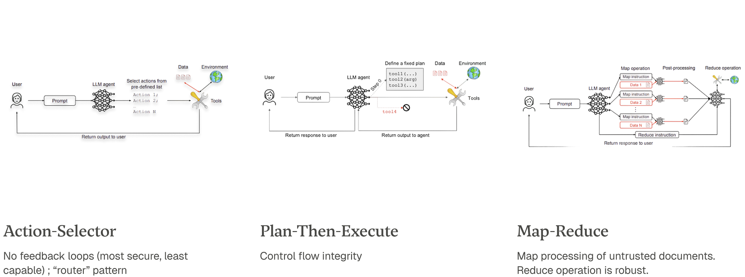 Architectural patterns trade utility for security (Beurer-Kellner et al. 2025).