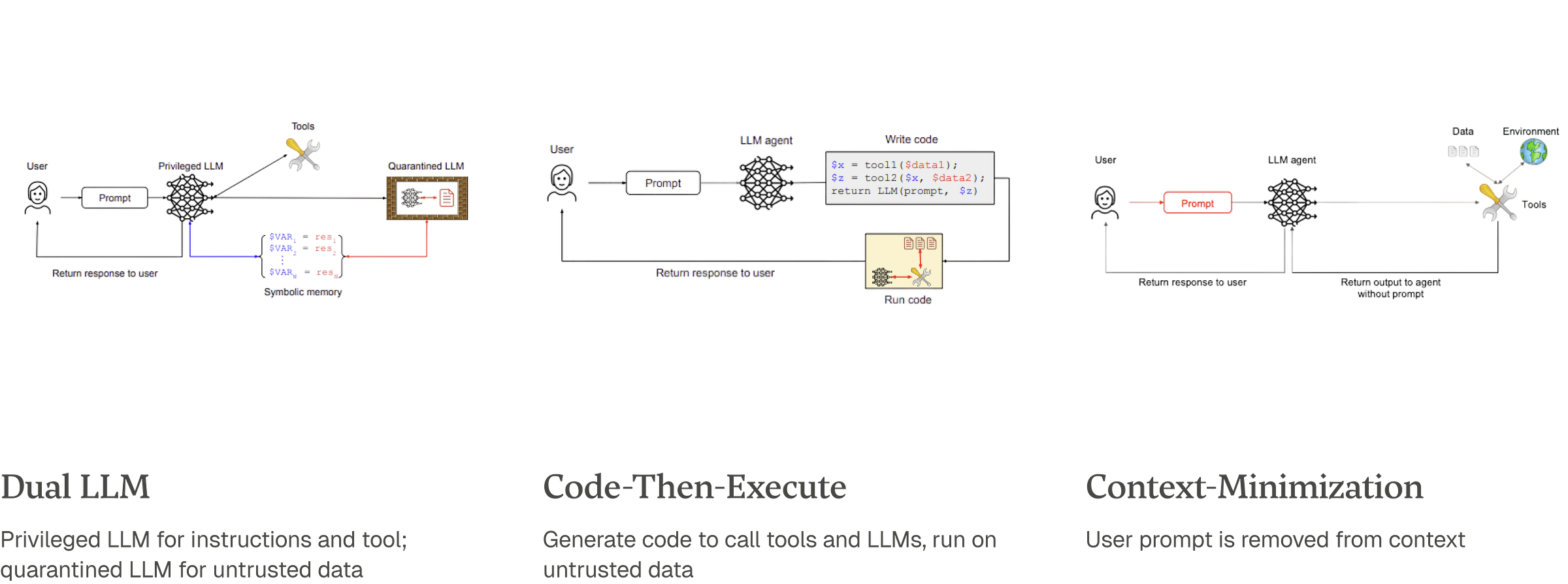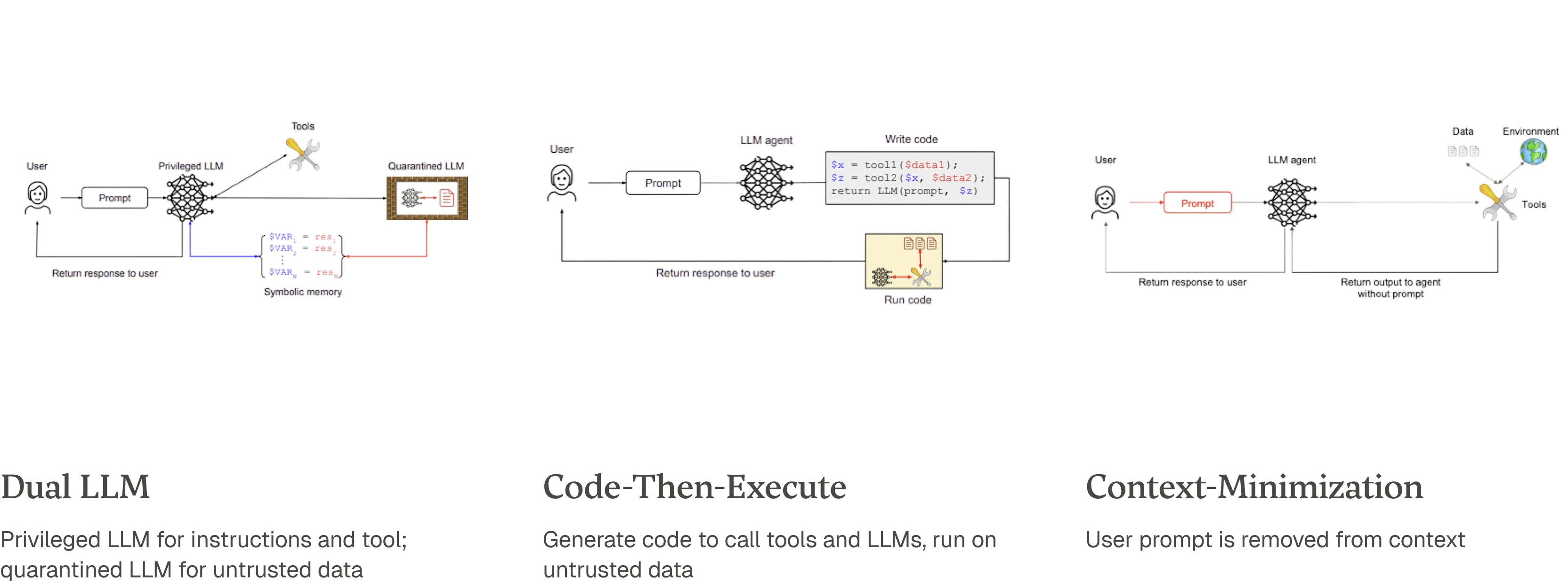 Context-Minimization: The user’s prompt is removed from the LLM’s context before it formulates its final response. This is effective against direct prompt injection but not the indirect attacks common in agentic workflows.